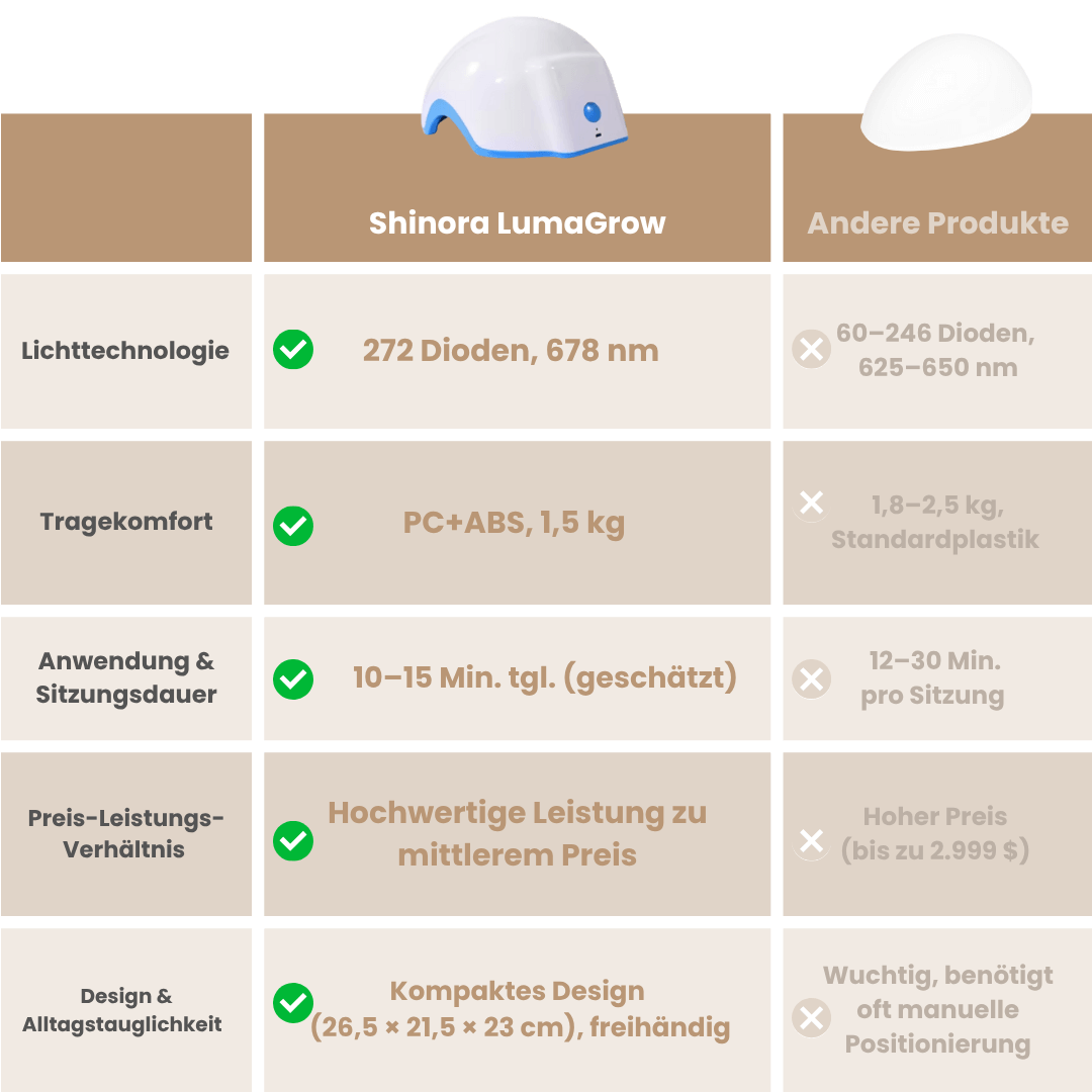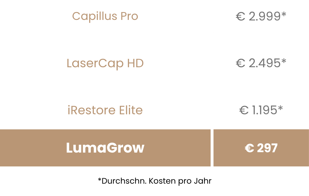 Der LumaGrow Haarwuchshelm bietet Ihnen hochwertige LED-Rotlichttherapie mit 272 Dioden – zu einem Bruchteil der Kosten von Klinikbesuchen oder Laserhauben. Genießen Sie sichtbare Ergebnisse bequem von zu Hause aus – ganz ohne monatliche Gebühren oder langfristige Verpflichtungen.