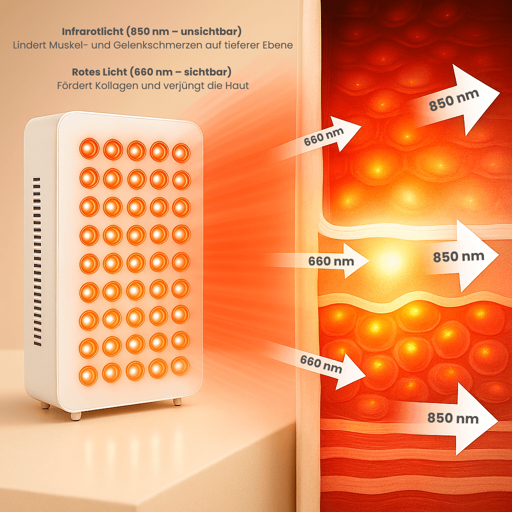 Ja, viele Nutzer berichten von spürbarer Linderung bei Gelenkbeschwerden, Muskelverspannungen und Entzündungen – ganz ohne Medikamente. Die Kombination aus rotem und nahinfrarotem Licht wirkt tief ins Gewebe und fördert die Zellregeneration.