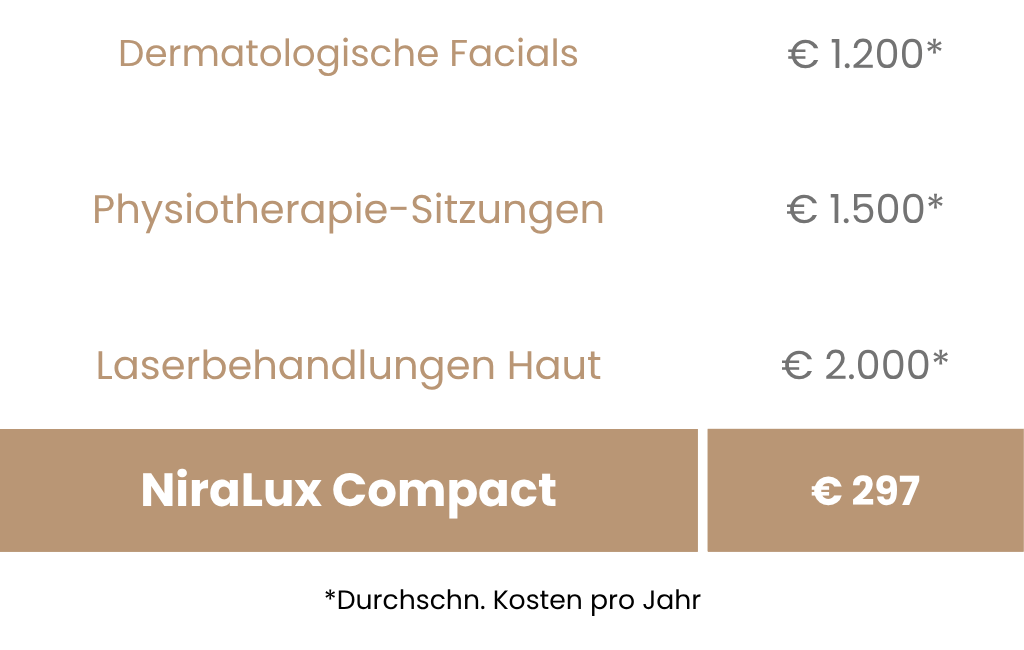 Warum jedes Mal hunderte Euro für Kosmetikbehandlungen, Schmerztherapien oder invasive Hautpflege ausgeben? NiraLux Compact unterstützt Sie mit vergleichbaren Ergebnissen – bequem zu Hause, wann immer Sie möchten und zu einem Bruchteil der Kosten.