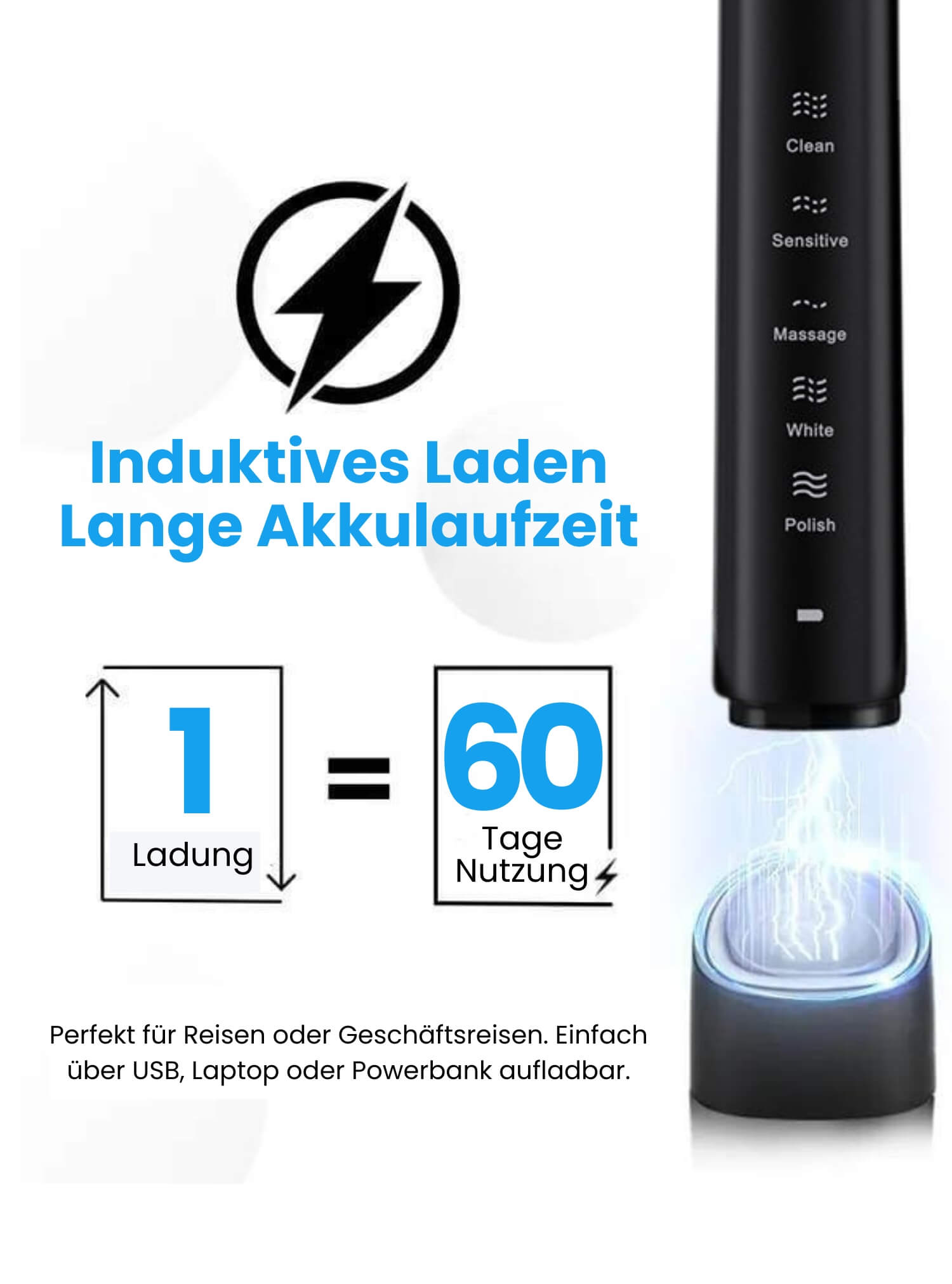 Stell deine Zahnbürste einfach in die Ladestation – kein Einstecken, kein Aufwand. Mit einer Akkulaufzeit von 60 Tagen (2x pro Tag für 2 Minuten) musst du nur alle zwei Monate daran denken. Praktisch, sorgenfrei und ideal für deinen Alltag oder für den Urlaub.