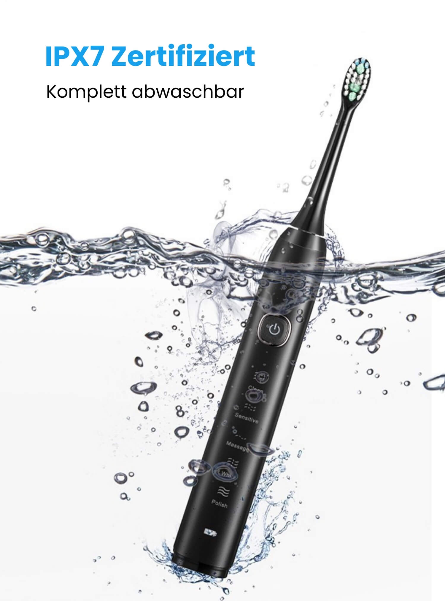 Nutze deine Zahnbürste sorgenfrei – ob unter der Dusche, am Waschbecken oder auf Reisen. IPX7-Zertifizierung garantiert Langlebigkeit und erleichtert deine tägliche Routine spürbar.