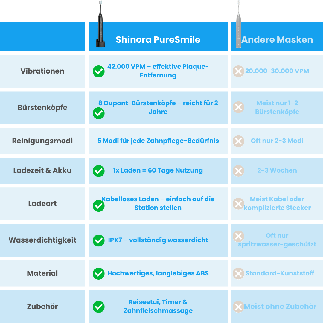 Warum tausende von Euro für teure Zahnbehandlungen ausgeben, wenn du mit der PureSmile Schallzahnbürste für einen Bruchteil des Preises die gleichen Ergebnisse erzielen kannst? Sie spart dir nicht nur Geld, sondern auch die ständige Suche nach aufwendigen Alternativen.