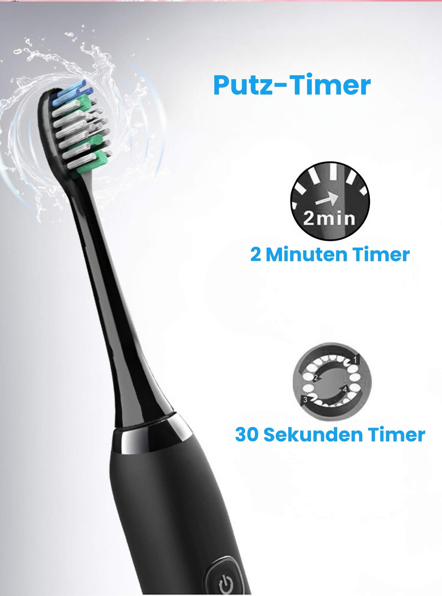 Der 2-Minuten-Timer mit 30-Sekunden-Erinnerung hilft dir, jede Zahnzone gründlich zu reinigen. So wird deine Mundhygiene effektiv und einfach – jeden Tag, ganz ohne Nachdenken.